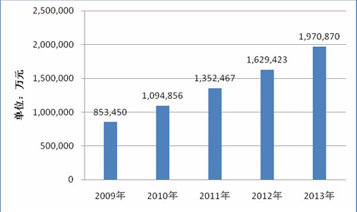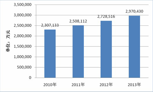 环卫专用车作为环卫装备中一个重要的组成部分,依据功能可分为路面保洁作业车、垃圾收集转运车及其他环卫车类,其中路面保洁作业车包括扫路车、清洗扫路车、清洗车和洒水车等。随着我国经济的快速发展,人们生活条件的不断改善,对城市环境清洁卫生的要求也在提高,城市街道路面、高速公路、一级公路和二级公路路面的保洁工作都要求摆脱传统人工清扫的低效率作业方式,因此,机械化程度高和清扫效率高的扫路车的市场需求迅速膨胀,路面保洁作业车进入了快速发展阶段。图1中所示,2003-2009年路面保洁作业车的年增长速度达到26%左右。随着全球经济的回升向好和国家政策的扶持,预计我国路面保洁作业车市场仍将保持这一较高速度的增长,2010-2013年市场规模将逐年增加至422,197万元,具体见图2。