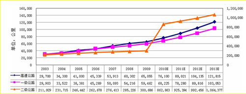 图表4 2003-2013年高速公路、一级公路及二级公路实际及预测里程数