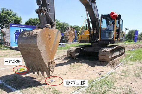 “高尔夫”这一比赛环节不需要移动挖掘机,只需进行原地回转操作即可。这个项目也需要对铲斗做一个小小的改装,即在铲斗最左侧的第一个斗齿上加装一个家用的不锈钢勺子。