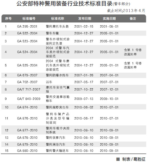《政府采购信息报》记者通过多方查询,并向专业人士求证,终于了解到,目前国内所有公安系统的警用车标准都由公安部特种警用装备标准化技术委员会(以下简称"公安部警标委")制定,并在其官方网站公布。