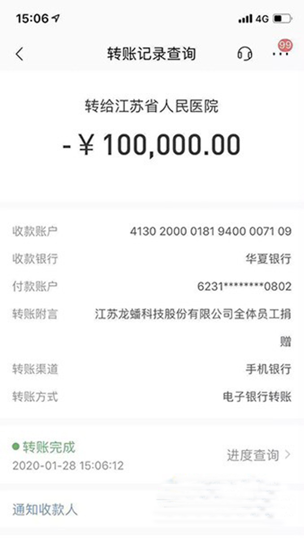 这是2020年1月28日,龙蟠科技员工代表和江苏省人民医院财务工作人员之间的一段对话,此时,距离省人院发出接受社会捐赠的公告,只有短短的十几个小时。