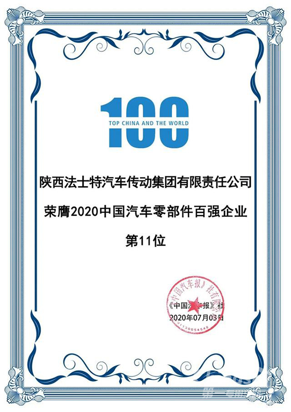 2020年7月3日,2020年全球汽车零部件企业百强和中国汽车零部件企业百强发布会在线上举行。会议现场,2020年汽车零部件企业双百强榜与榜单解读白皮书正式发布。法士特集团同时入围“双百强”榜单,位列“2020中国汽车零部件百强企业”第11位、“2020全球汽车零部件百强企业”第97位。