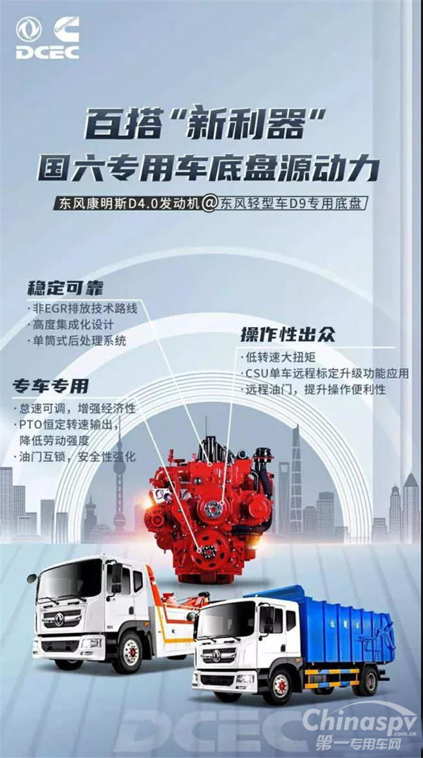 东风康明斯D4.0发动机适应各类工作场景,同时配合东风轻型车D9专用底盘,在国六时代的城市专用车领域拥有强大的优势。