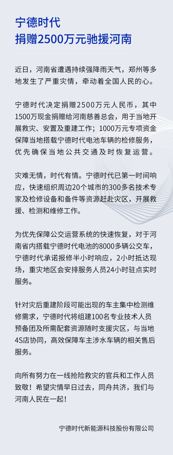 危难显担当,宁德时代捐赠2500万元驰援河南