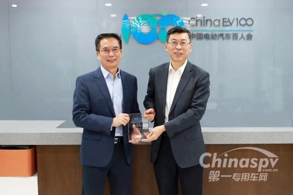 中国电动汽车百人会副理事长兼秘书长张永伟(图右)向康明斯副总裁彭立新博士(图左)授牌