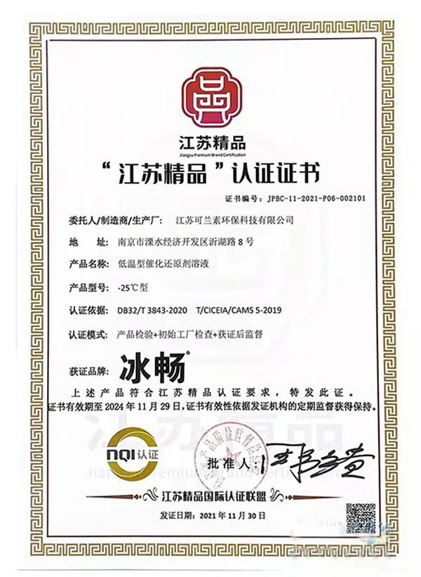 获得“江苏精品”认证证书的可兰素冰畅品牌,是低温型催化还原剂溶液,冰畅产品具有超强抗低温、采用欧洲和北美低温还原技术、采用高纯度的低温还原剂的突出特点,为有低温需求的卡友提供优质车用尿素溶液,全面助力国六排放标准落地。