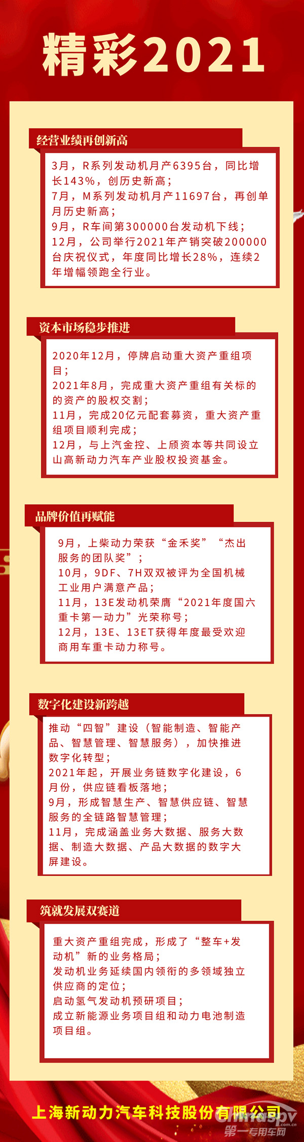 2022年1月7日第一专用车网记者获悉,日前,由上海市市场监督管理局正式核准,公司名称由上海柴油机股份有限公司变更为上海新动力汽车科技股份有限公司。英文名称由SHANGHAI DIESEL ENGINE COMPANY LIMITED变更为ShanghaiNew Power Automotive Technology Company Limited。