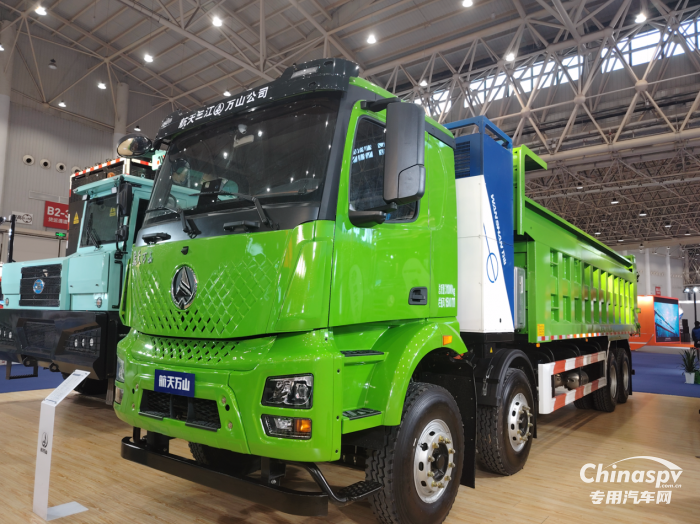 万山公司依托50年军用重型和超重型车辆技术积淀,深耕新能源重卡行业,完成了环卫、牵引、自卸三大平台全系列产品的开发,此次展示的8x4纯电动自卸车搭载了万山公司自研的“军”转“民”的电控系统,车辆效率高、能耗低,军工级限滑控制可有效应对恶劣泥泞路面,能为客户提供更好的驾驶体验和更高的创收效率。