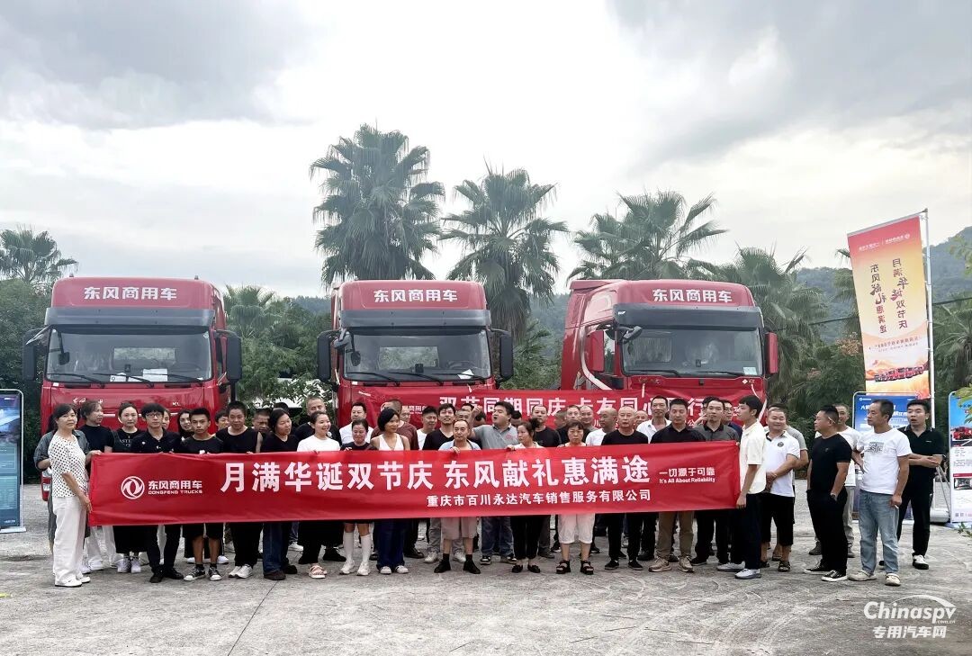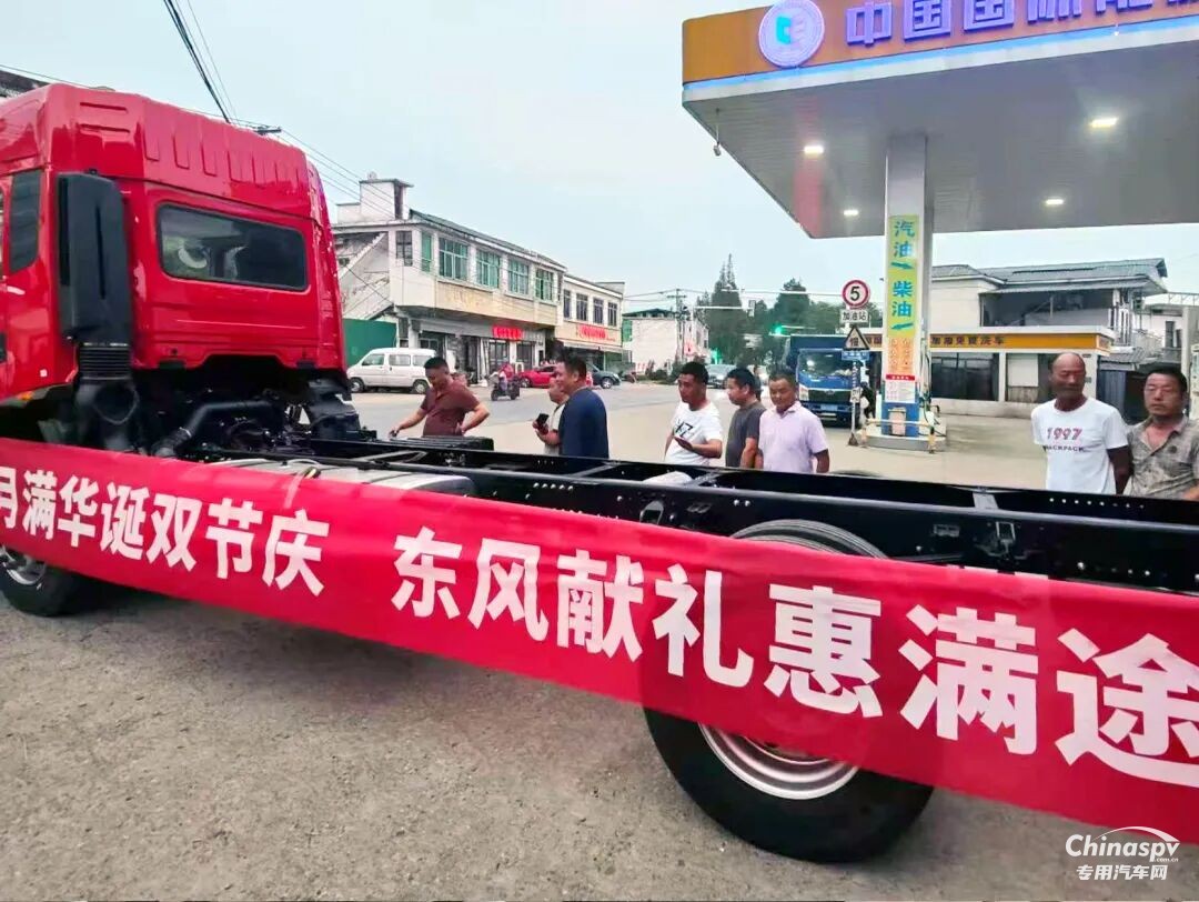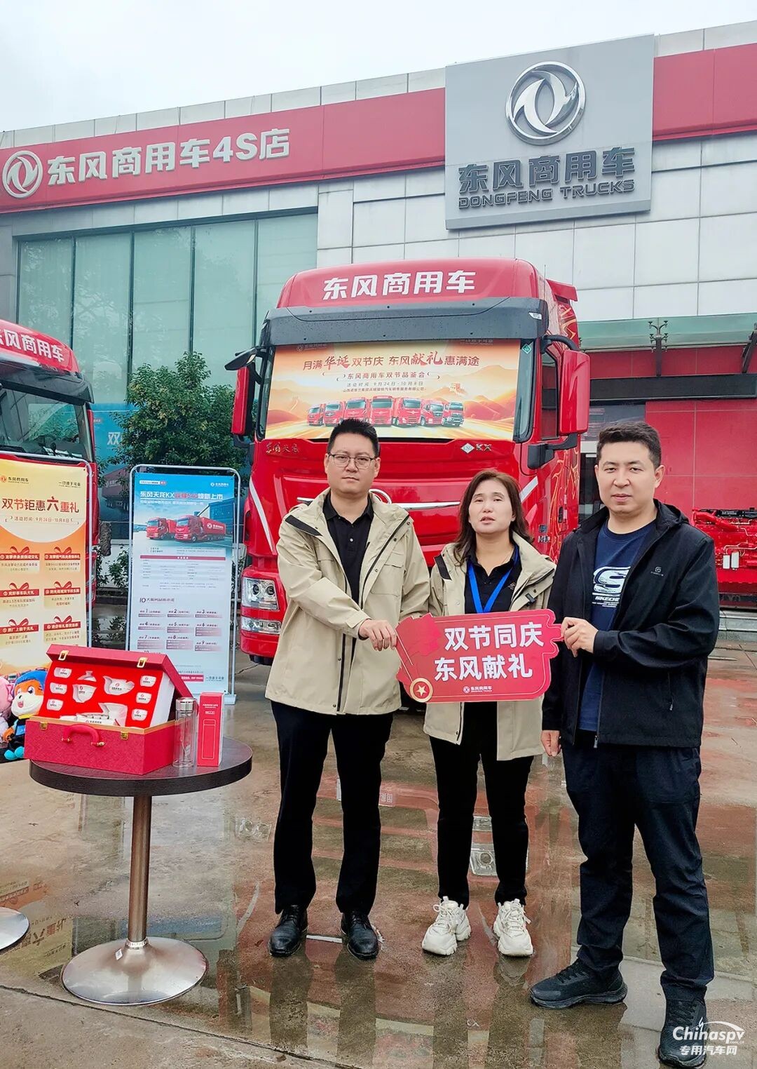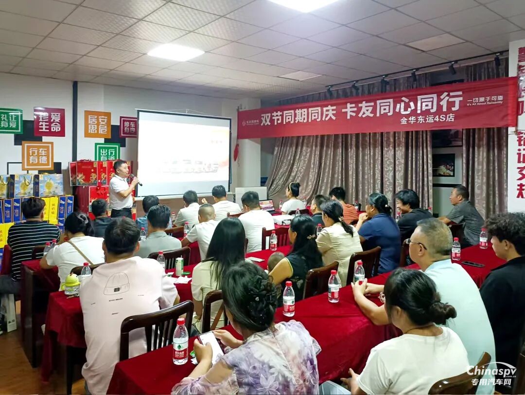 协同金华东运4S店开展“月满华诞双节庆 东风献礼惠满途”活动。现场布置喜庆,众人齐聚,围绕着醒目的红色横幅合影,周边还有礼品陈列,营造出热烈的氛围。此次活动既借助双节热度为客户带来购车优惠,也展现出东风卡车的品牌魅力,客户开启高效运输新体验。